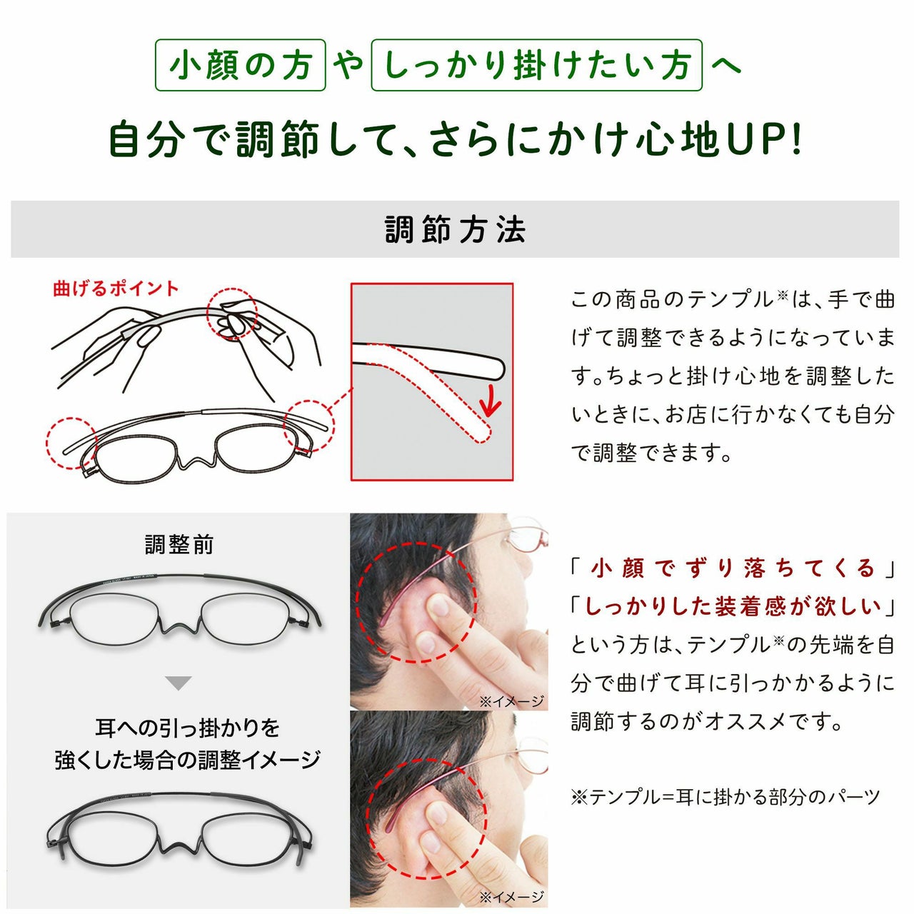 耳に掛かる部分を曲げて、ご自身で掛け心地を調整できるモデル。ご愛用者様にもおすすめです。