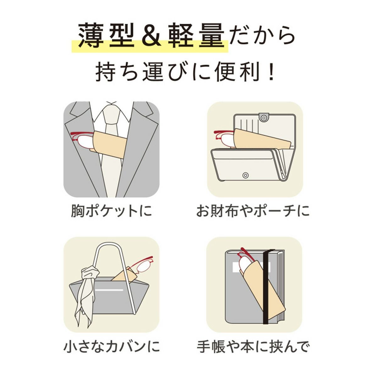 『ペーパーグラス』は折り畳むと薄くフラットになるのでお財布や胸ポケット、栞がわりに手帳に挟んだりしてコンパクトに収納でき、スマートな所作で取り出せるという薄型めがね。眼鏡の街・鯖江の技術力を活かした特許構造により「紙のように薄くフラットになる」ことから名付けられました。