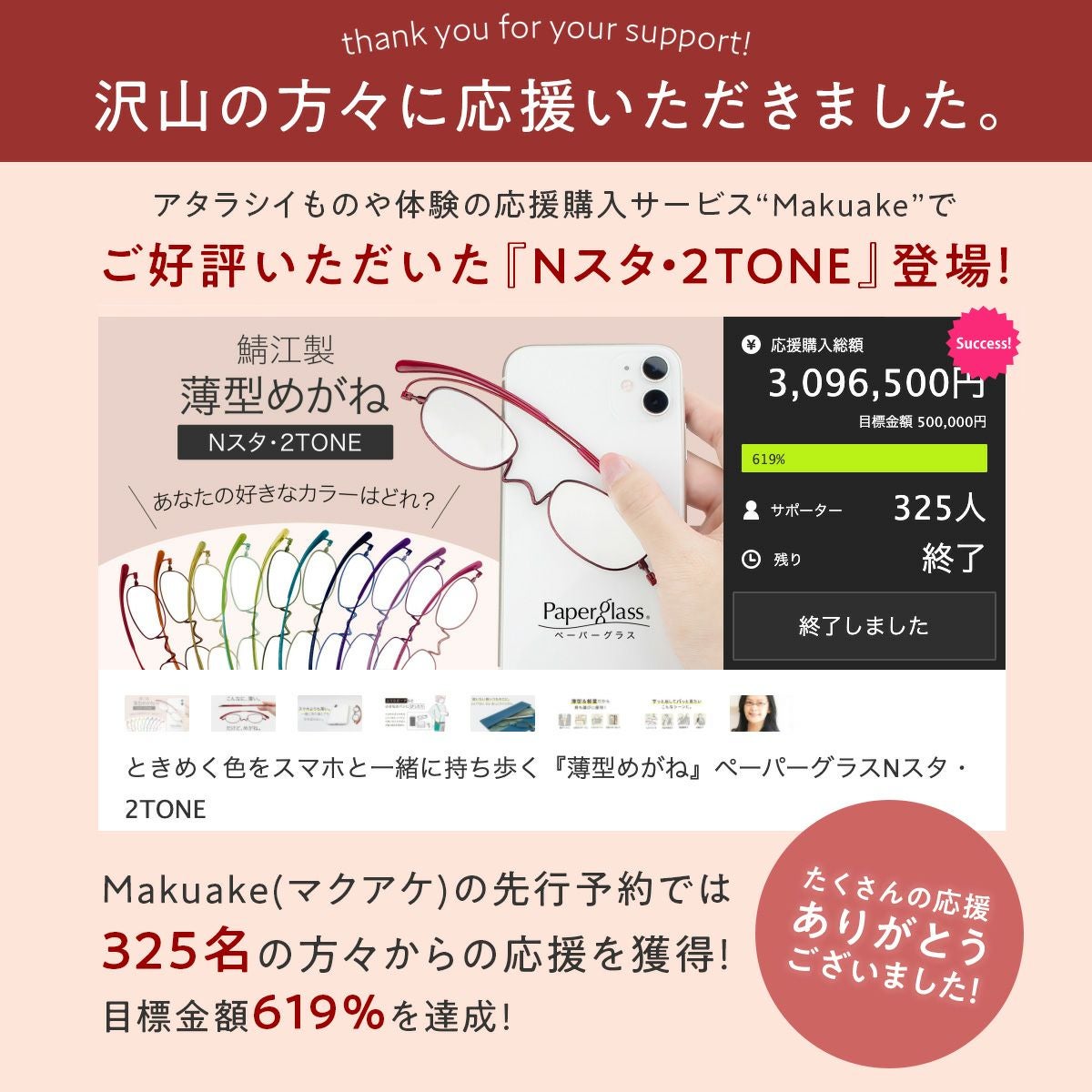 おしゃれで軽くて携帯しやすい「ペーパーグラス」で、めがねの持ち運びによるわずらわしさや、いくつになっても好奇心を奪われることなく人生をアクティブに楽しんでいただきたいという想いで1本1本丁寧に仕上げています。